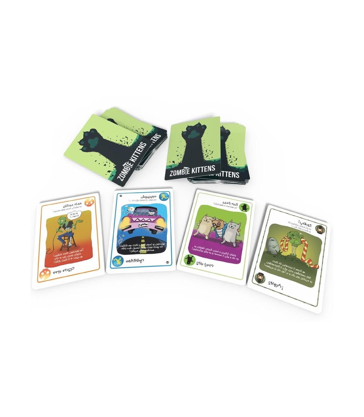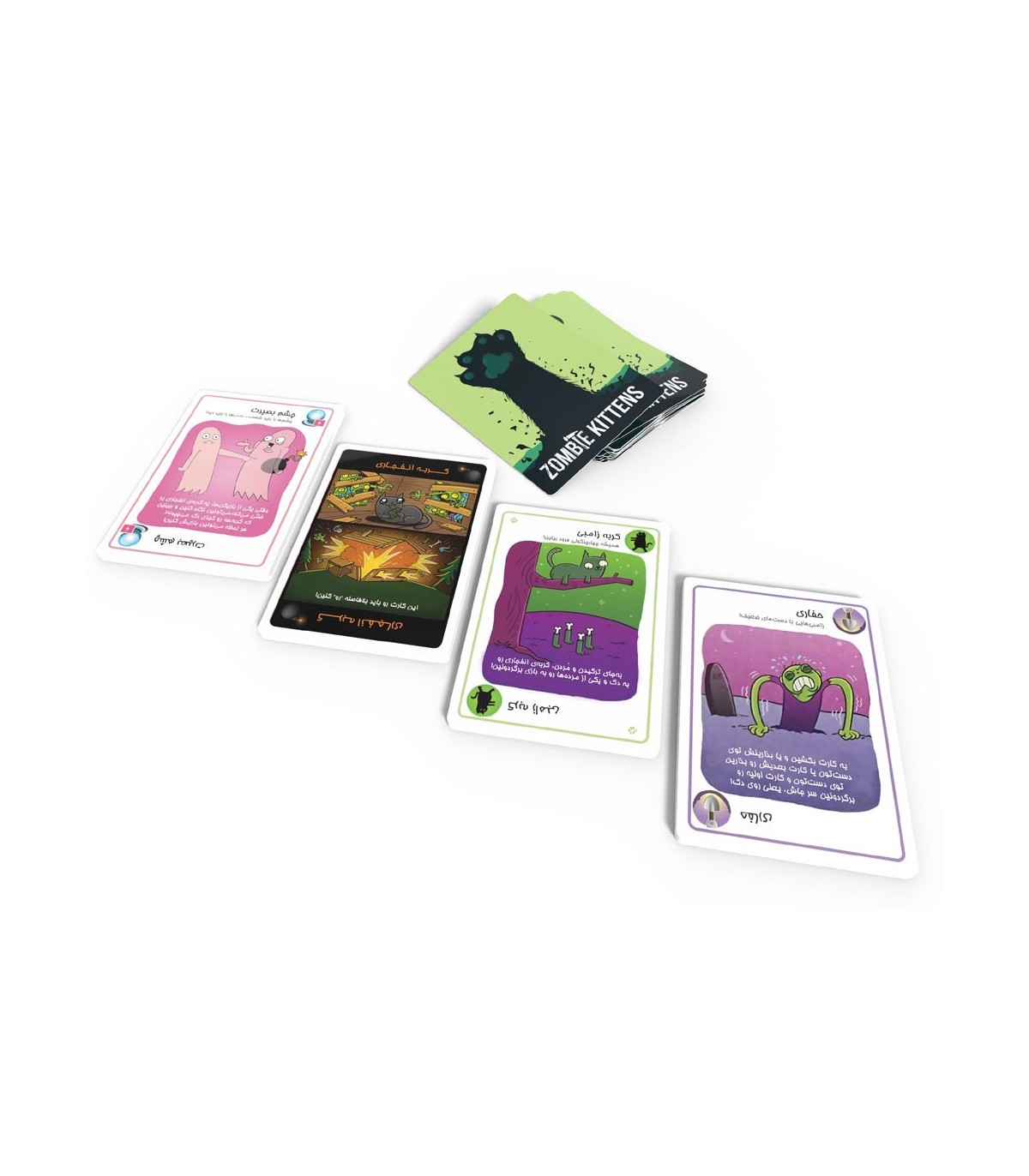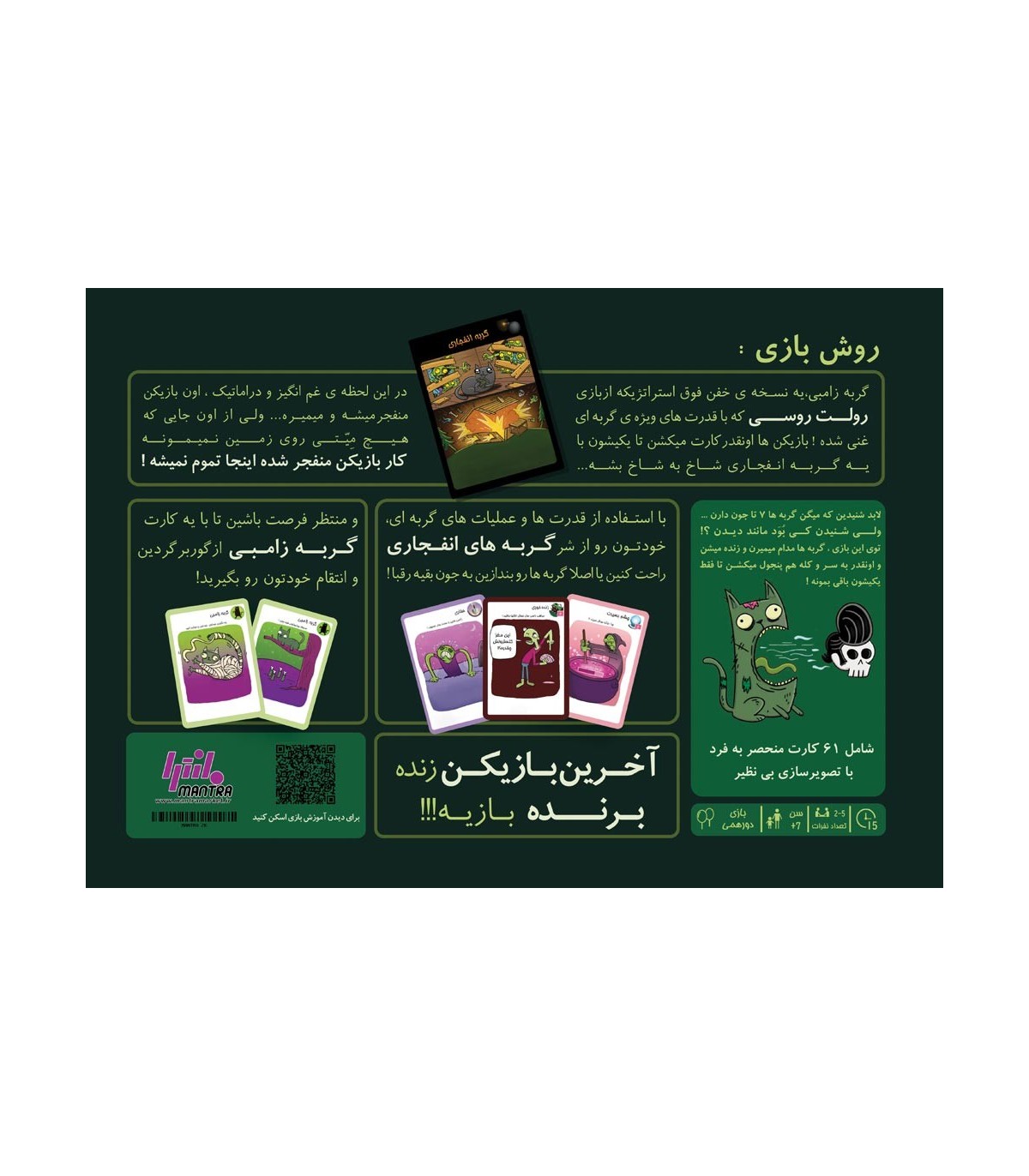 گربه زامبي يک بازي کاملا مستقل و جديد است که اخيرا منتشر شده ، در بازي گربه زامبي فقط بايد سعي کنيد که منفجر نشويد و تا پايان بازي زنده بمانيد . اگر منفجر نشويد، مي بريد ولي نکته مهم اينجا است که اگر منفجر شويد باز هم ممکنه ببريد چون بعد از منفجر شدن ميتونيد به عنوان زامبي قويتر از قبل به بازي برگرديد ولي به شرط اينکه يکي از بازيکنان مرده ي ديگر را نيز با خودتان زنده کنيد و به بازي برگردانيد . در بازي گربه زامبي ابتدا کارت هاي گربه انفجاري و کارت هاي گربه زامبي ، که مي تواند شما را به همراه يک بازيکن مرده ديگر زنده کند ، را از بازي خارج مي کنيد. سپس تمام کارت ها را بر مي زنيد و به هر بازيکن هفت کارت به اضافه يک کارت گربه زامبي مي دهيد. کارت هاي گربه انفجاري را به تعداد يکي کمتر از بازيکنان، داخل دسته کارت ها گذاشته و بر مي زنيد که تشکيل دک کارت ها را مي دهد. دک کارت ها را در ميان ميز بازي گذاشته و هم اکنون بازي آغاز مي شود. هر کسي در نوبت خودش هر تعداد کارت که مي خواهد مي تواند از دستش بازي کند ولي نکته مهم اين است که در پايان نوبت، حتما بايد يک کارت از دک کارت هاي بازي بکشد. ممکن است اين کارت، يک کارت گربه انفجاري باشد و شايد هم خوش شانس باشيد و نباشد. ولي نگران نباشيد، حتي اگر گربه انفجاري باشد، شما هنوز يک کارت گربه زامبي داريد اگر هم نداشتيد پس از انفجار به عنوان زامبي داخل بازي خواهيد بود (فقط کارت هاي مخصوص زامبي هارا بازي ميکنيد و کارت هم نميکشيد) تا اين که اگر خوش شانس باشيد، يک نفر شما را با کارت گربه زامبي اش به زندگي بازگرداند تا بتوانيد شانس خود را براي زنده ماندن و برنده بازي شدن امتحان کنيد . در اين بازي آخرين بازيکن زنده برنده بازي ميباشد